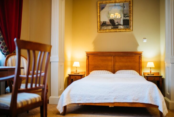 Do Państwa dyspozycji oddajemy 16 stylowo urządzonych pokoi gościnnych, umiejscowionych w klasycystycznym Pałacu Nowym z nieodpłatnym parkingiem na terenie kompleksu pałacowego.